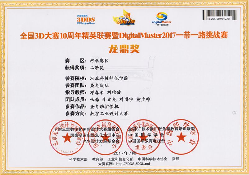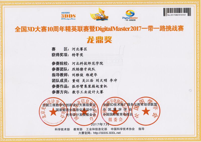 为参加全国3D大赛,taptap点点体育组建了由机制专业和农机专业的同学4支团队,在邓春岩、刘雅俊、张小芹等老师的精心指导下,综合运用所学的机械制图和三维建模技术,精心设计,积极创新。近日,经全国相关领域专家和教授评审,荣获大赛(河北赛区)特等奖1项、二等奖3项。